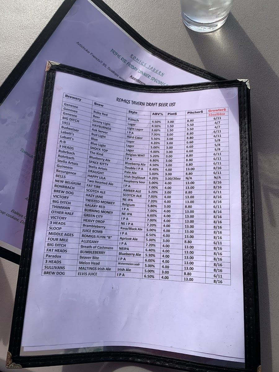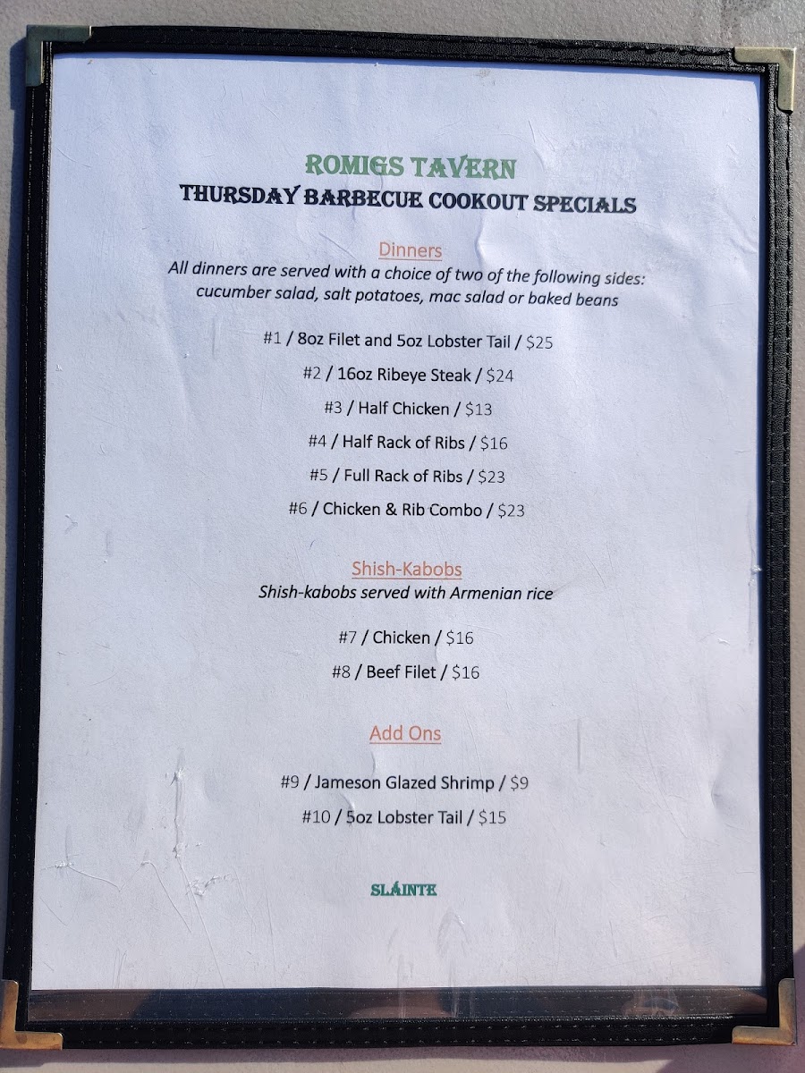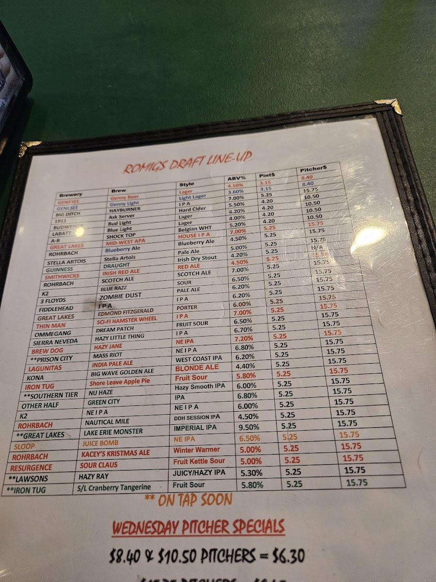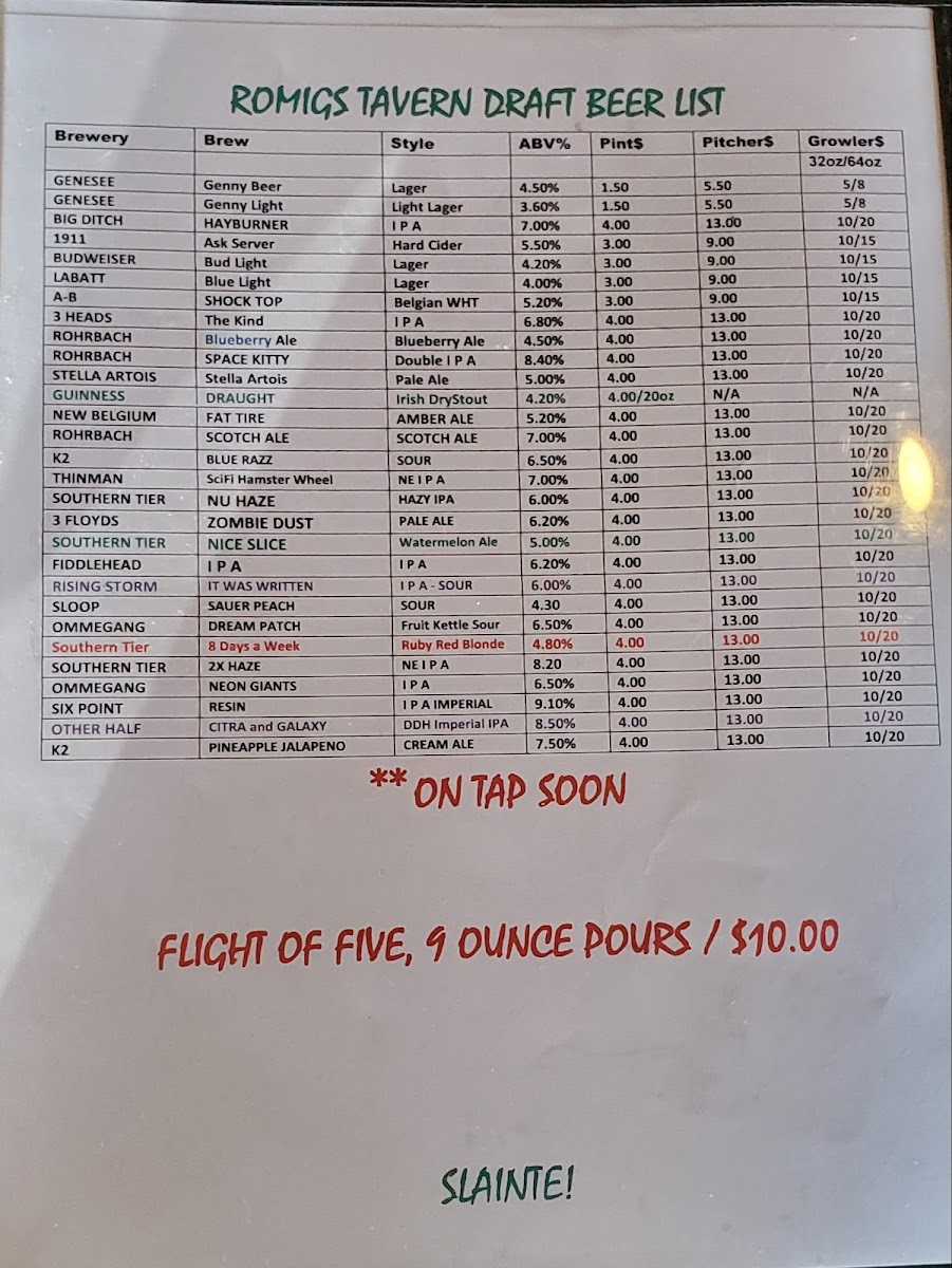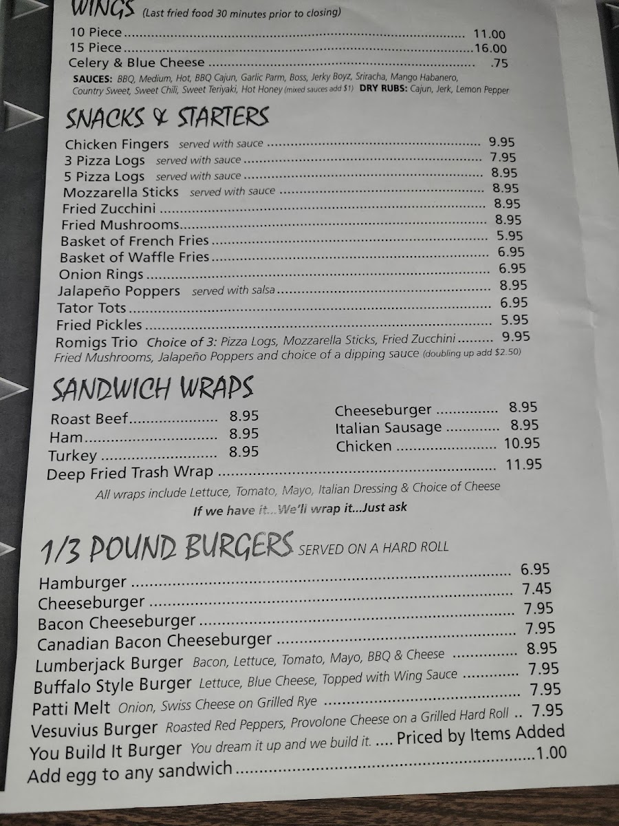 Romig’s Tavern offers a menu rooted in classic bar and grill comfort, featuring straightforward, satisfying dishes that pair well with a lively pub atmosphere. The menu leans into familiar favorites like Buffalo chicken wings, cheeseburger plates, and the hearty Garbage Plate Wrap, making it a fitting spot for casual outings and group gatherings.